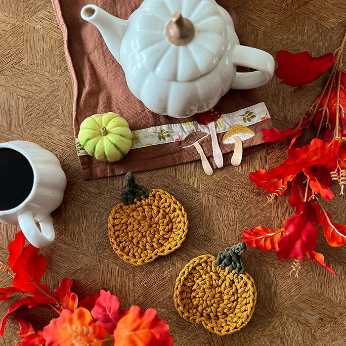 Podkładka pod kubek w kształcie dyni. Ręcznie wykonana na szydełku ze 100% sznurka bawełnianego. Idealna na jesienne wieczory – nie tylko chroni powierzchnie przed gorącym kubkiem, ale także wprowadza przytulny, sezonowy klimat.